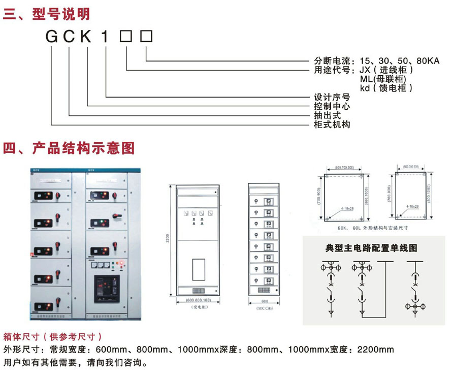 >本公司生產的抽出式低壓開關柜GCK系列低壓開關柜由動力配電中心(PC)柜和電動機控制中心(MCC)兩部分組成。該裝置適用于交流50(60)Hz、額定工作電壓小于等于660V、額定電流4000A及以下的控配電系統(tǒng),作為動力配電、電動機控制及照明等配電設備。